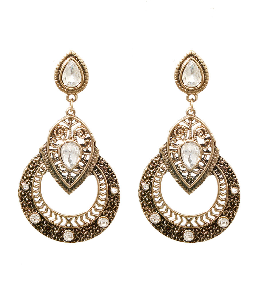 Burnish gold metal drop earrings with clear stones. Post back closure