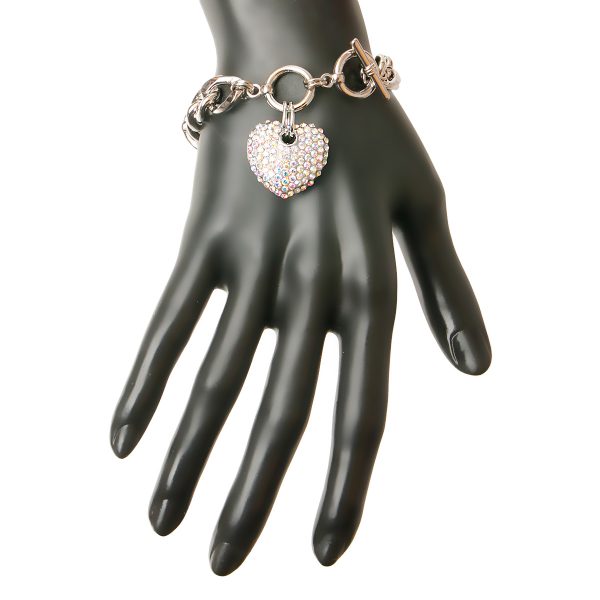 Silver Chain Toggle Bracelet Featuring Aurora Borealis Rhinestone Heart Charm. Heart measures 1 inch