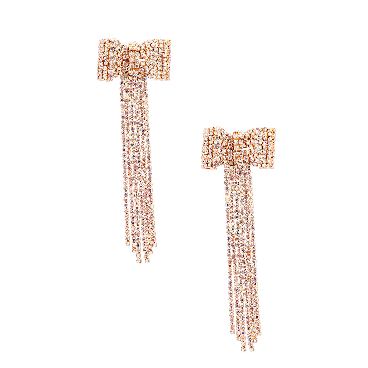 High Quality Gold Metal Bow Earrings Featuring Aurora Borealis Rhinestone Fringe Detailing. Earrings measure 1.5 inches wide