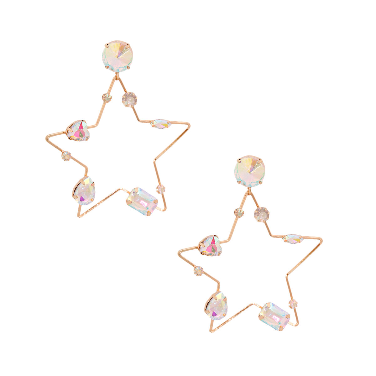 Gold Metal and Aurora Borealis Crystal Star Drop Earrings Featuring Various Crystal Shapes. Earrings measure 3 inches wide