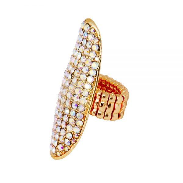 Gold Aurora Borealis Rhinestone Long Oval Stretch Ring. 2.1 inches long