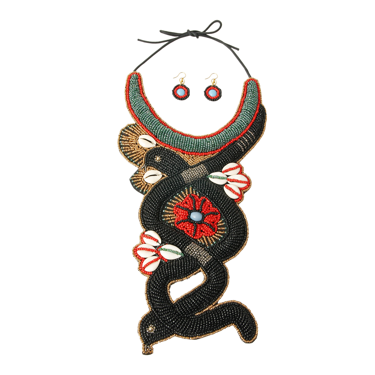 Garden Theme Designer Inspired Beaded Cowrie Shell Necklace Set.Tribal Black Beaded Bib Style Necklace Set Featuring Cowrie Shell and Snake Pattern Details and Raised Collar. Black Vegan Leather Backing. Adjustable Cord Tie. 10 inches long and 6.5 inches wide. Handcrafted. Fair Trade. Exclusive
