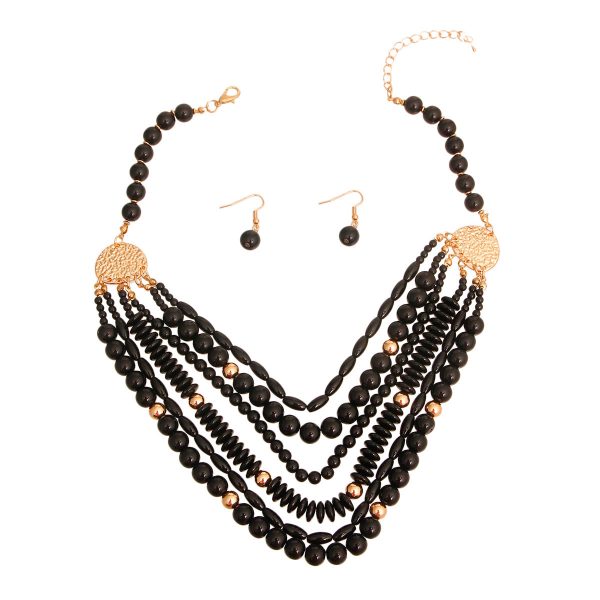 Black 6 Layered Bead Necklace set.Acrylic and gold bead statement necklace with drop earrings. 18 inches length.