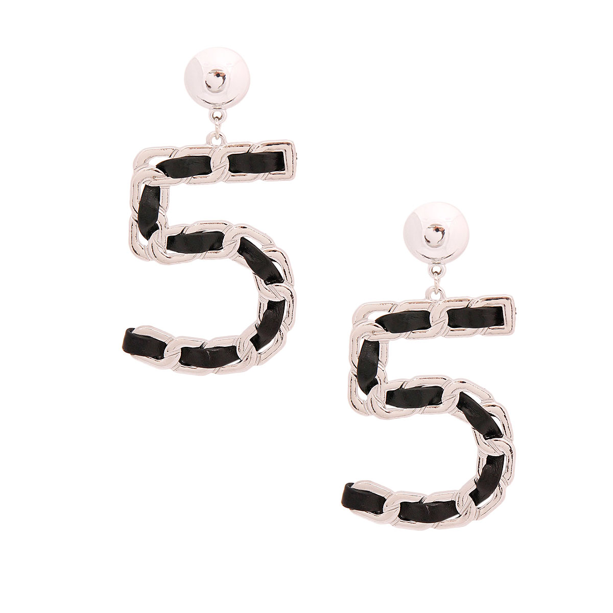 Designer Inspired High Quality Silver Metal Drop Earrings Featuring No 5 Woven with Black Vegan Leather. Earrings measure 1.65 inches wide