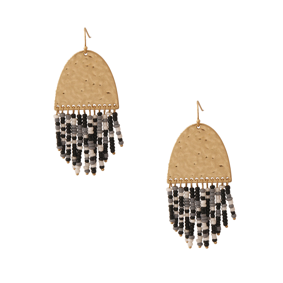 Hammered Gold Metal Drop Earrings Featuring Black and White Seed Bead Fringe Detail. 1.25 inches wide
