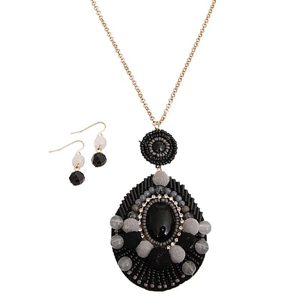 Gold Metal Chain Necklace Set Featuring Black Beaded Rhinestone Teardrop Pendant. Pendant measures 4 inches long