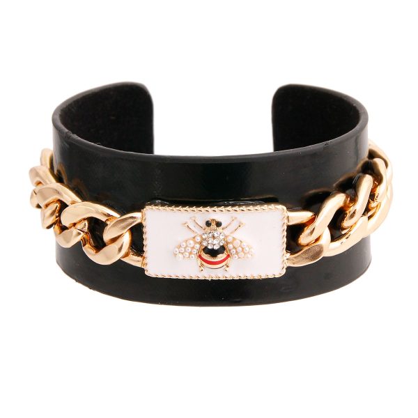 Designer Inspired Black Resin Cuff Bracelet Featuring Gold Metal Chain and Pearl Bee Detail. Cuff measures 1.25 inches wide. Black Velvet Interior