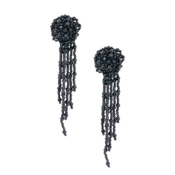 Cluster Ball Black Glass Bead Earrings Featuring Drop Fringe Detailing. Earrings measure 1 inch wide