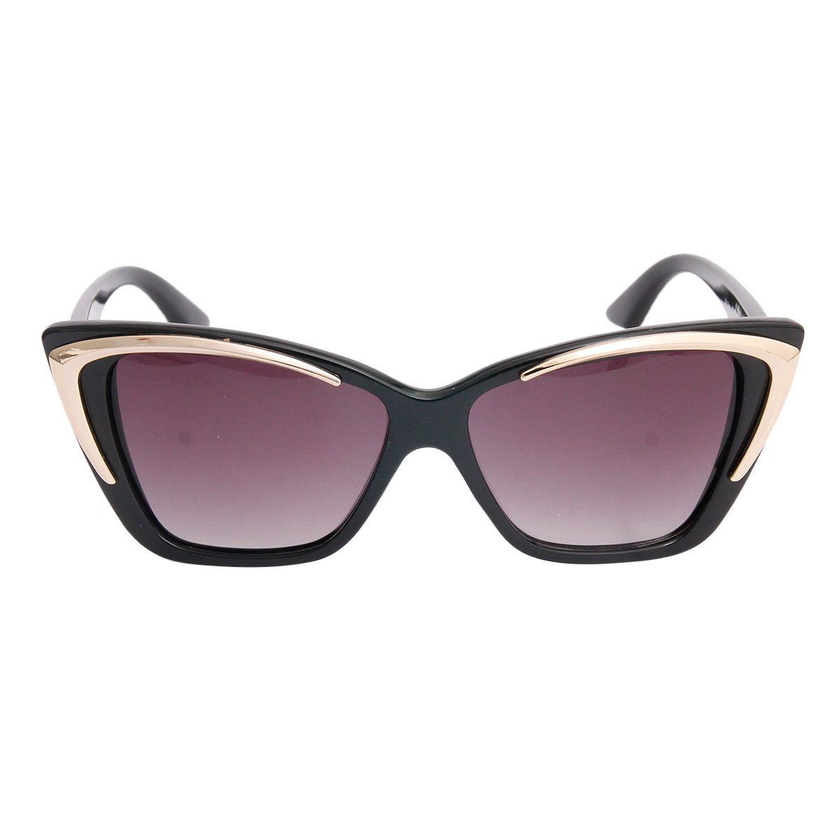 Black Plastic Cat Eye Retro Sunglasses Featuring Gold Edge Frame and Crocodile Texture Side Arm Detail. Sunglasses measure 6.25 inches across and 2 inches long