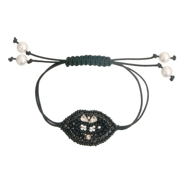 Adjustable Black Leather Cord Friendship Bracelet Featuring Embroidered Black Lips with Rhinestone Detailing. Lips measure 1.65 inches wide
