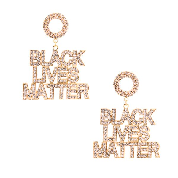 Gold Metal Drop Earrings Featuring BLACK LIVES MATTER Lettering with Clear Crystal Rhinestone Detailing. Earrings measure 2.5 inches wide