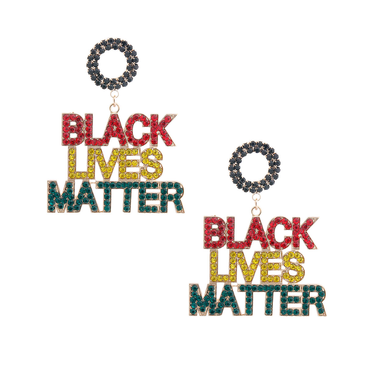 Gold Metal Drop Earrings Featuring BLACK LIVES MATTER Lettering with Multi Color Crystal Rhinestone Detailing. Earrings measure 2.5 inches wide