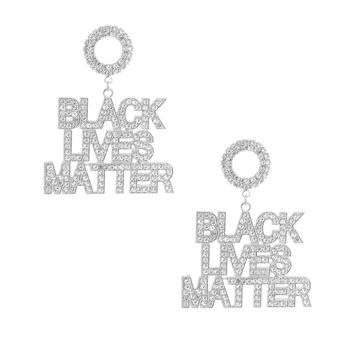 Silver Metal Drop Earrings Featuring BLACK LIVES MATTER Lettering with Clear Crystal Rhinestone Detailing. Earrings measure 2.5 inches wide
