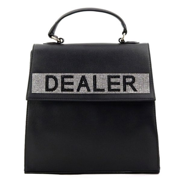 Black Vegan Leather Top Handle Flap Closure Handbag Featuring Rhinestone DEALER Detailing. Main Zipper Closure with Magnetic Flap. Open Interior with Small Zip Pocket. Detachable Shoulder Strap Included