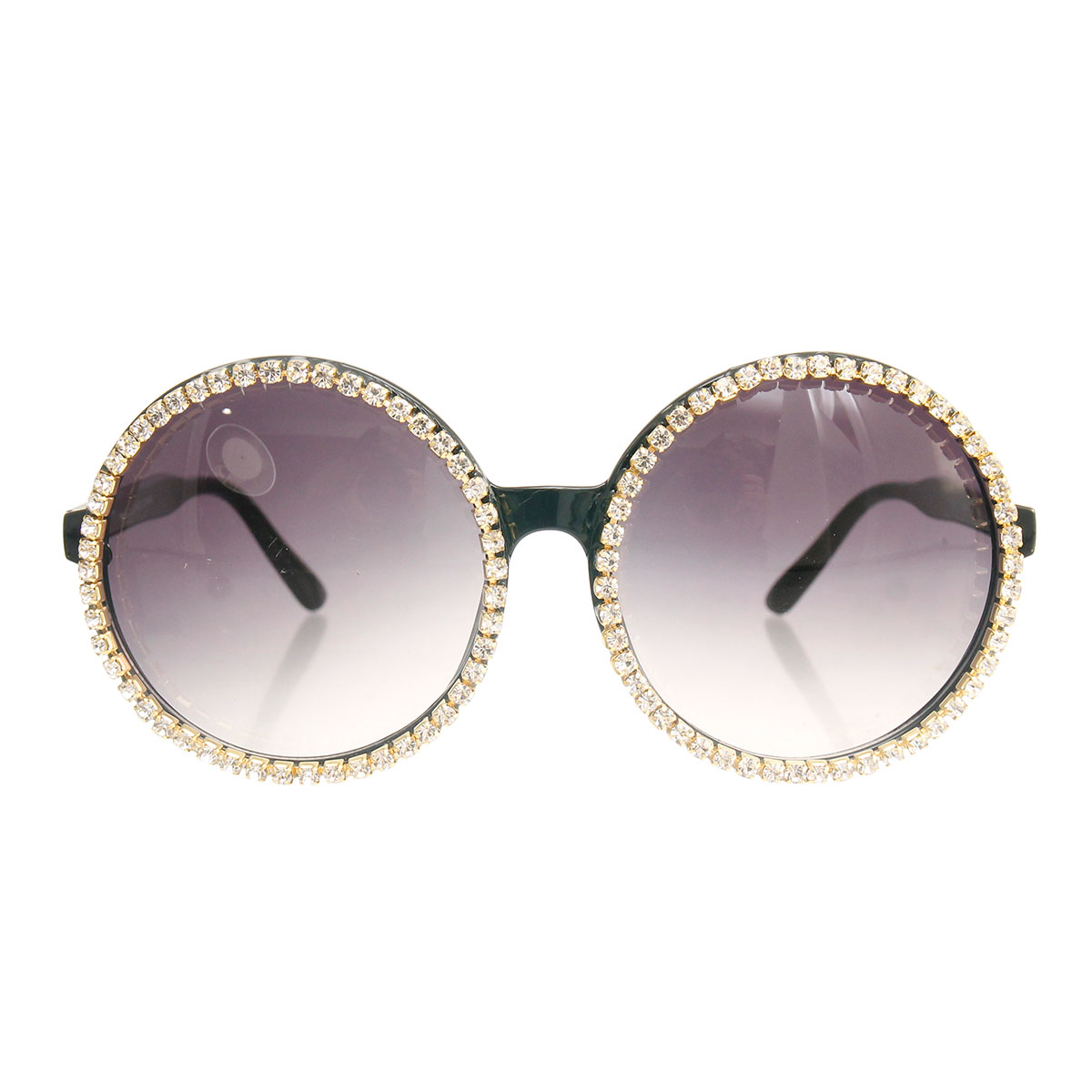 Black Plastic Retro Round Oversized Sunglasses Featuring Crystal Rhinestone Edging. Sunglasses measure 6.25 inches wide and 3 inches long