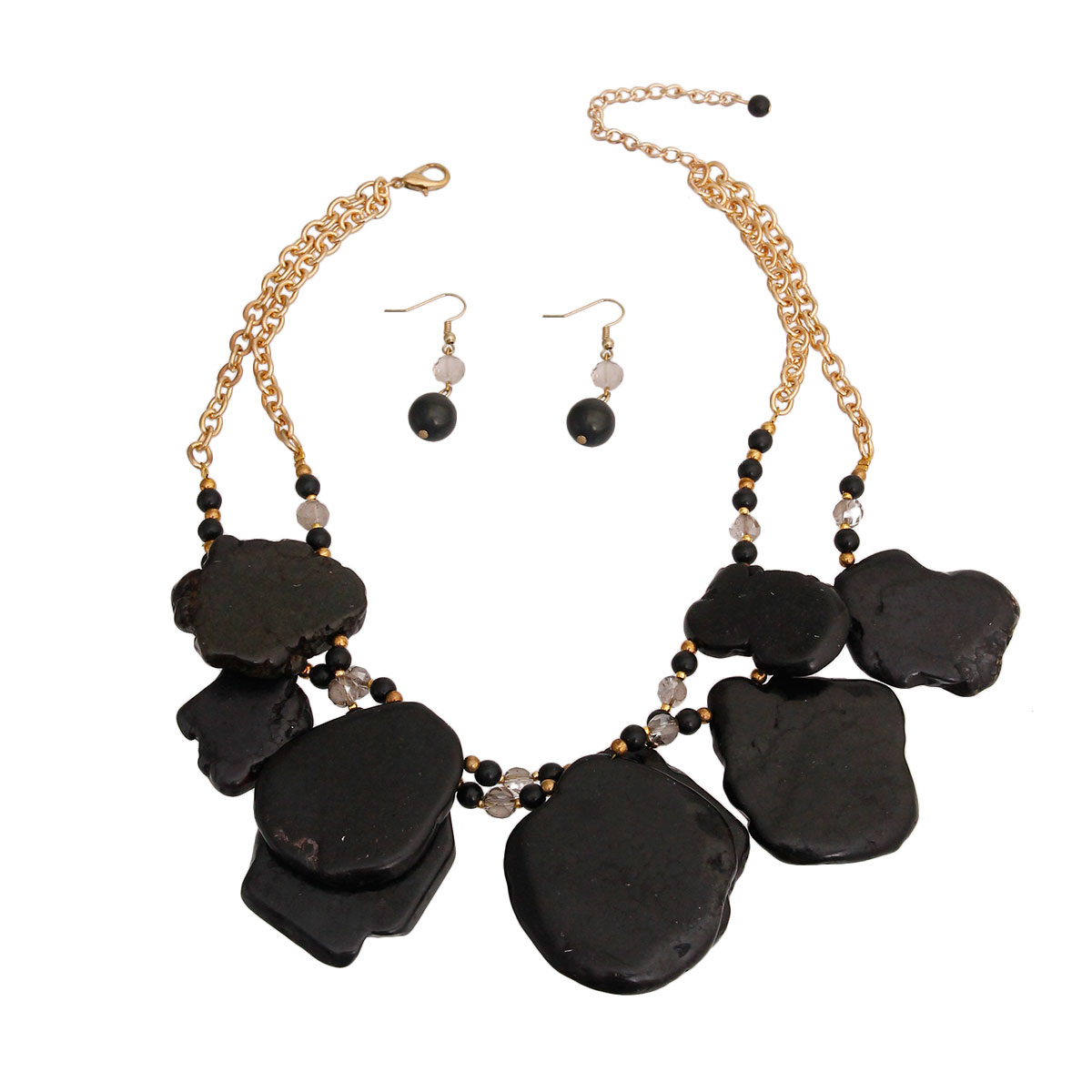 Gold Metal Chain Double Strand Necklace Set Featuring Beads and Black Stone Drop Details. Please allow for natural color and size variations. Stones measure approx 2 inches each