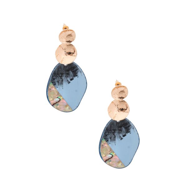 Textured Gold Metal Disc Drop Earrings Featuring Light and Dark Blue Acrylic and Abalone Shell Oval Detail. Earrings measure 1.5 inches wide. Allow for Natural Color Variations