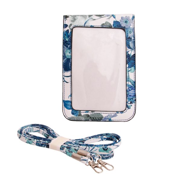 Blue Floral Print Vegan Leather Cellphone Wallet Crossbody Bag Featuring Clear Cellphone Pocket. Flap and Snap Closure. Front Pocket Contains 2 Card Slots. Detachable Shoulder Strap Included