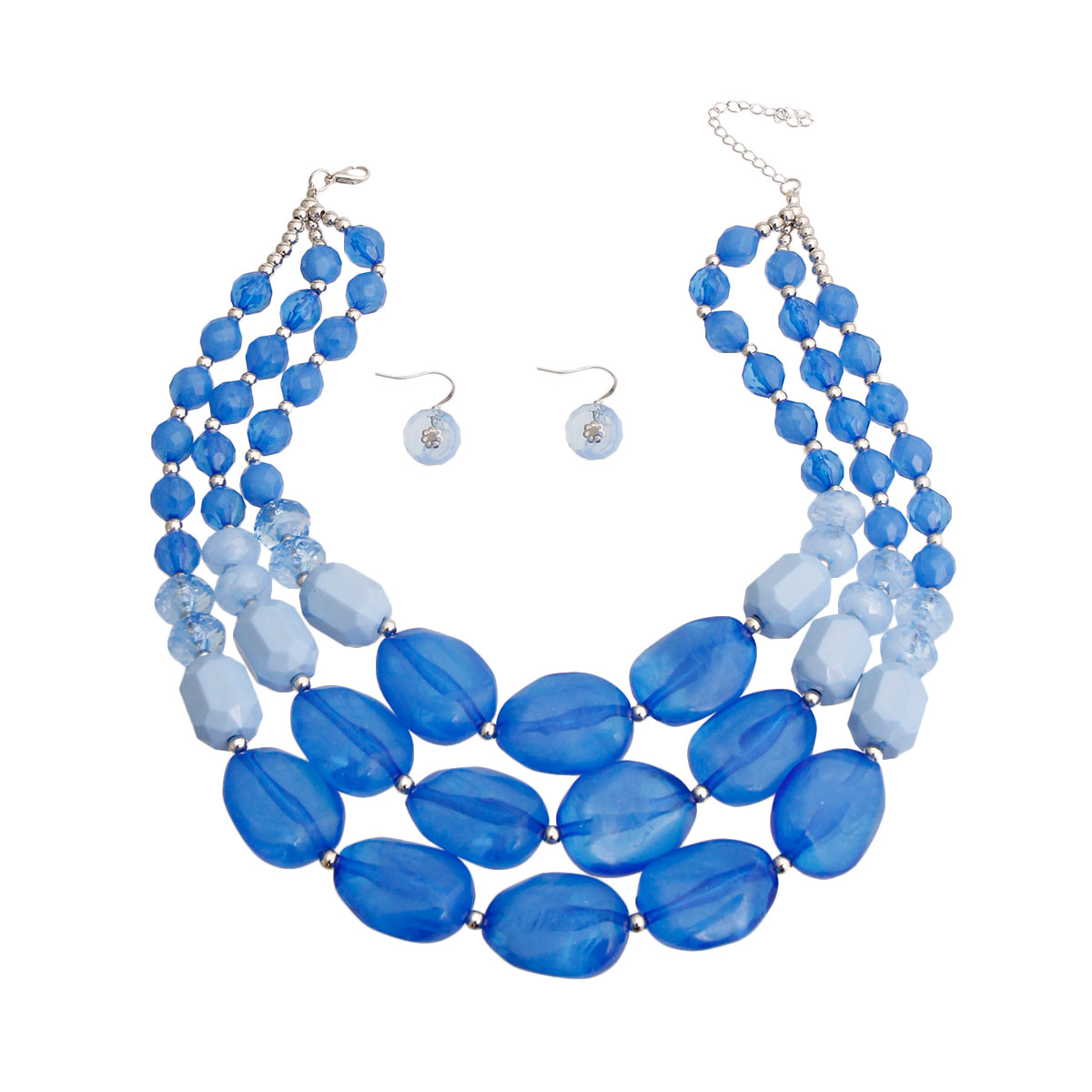 Light and Dark Blue Varying Shape Graduated 3 Strand Layered Necklace Set Featuring Chunky Marbled Blue Beads. Marbled Beads measure approx 1.5 inches each