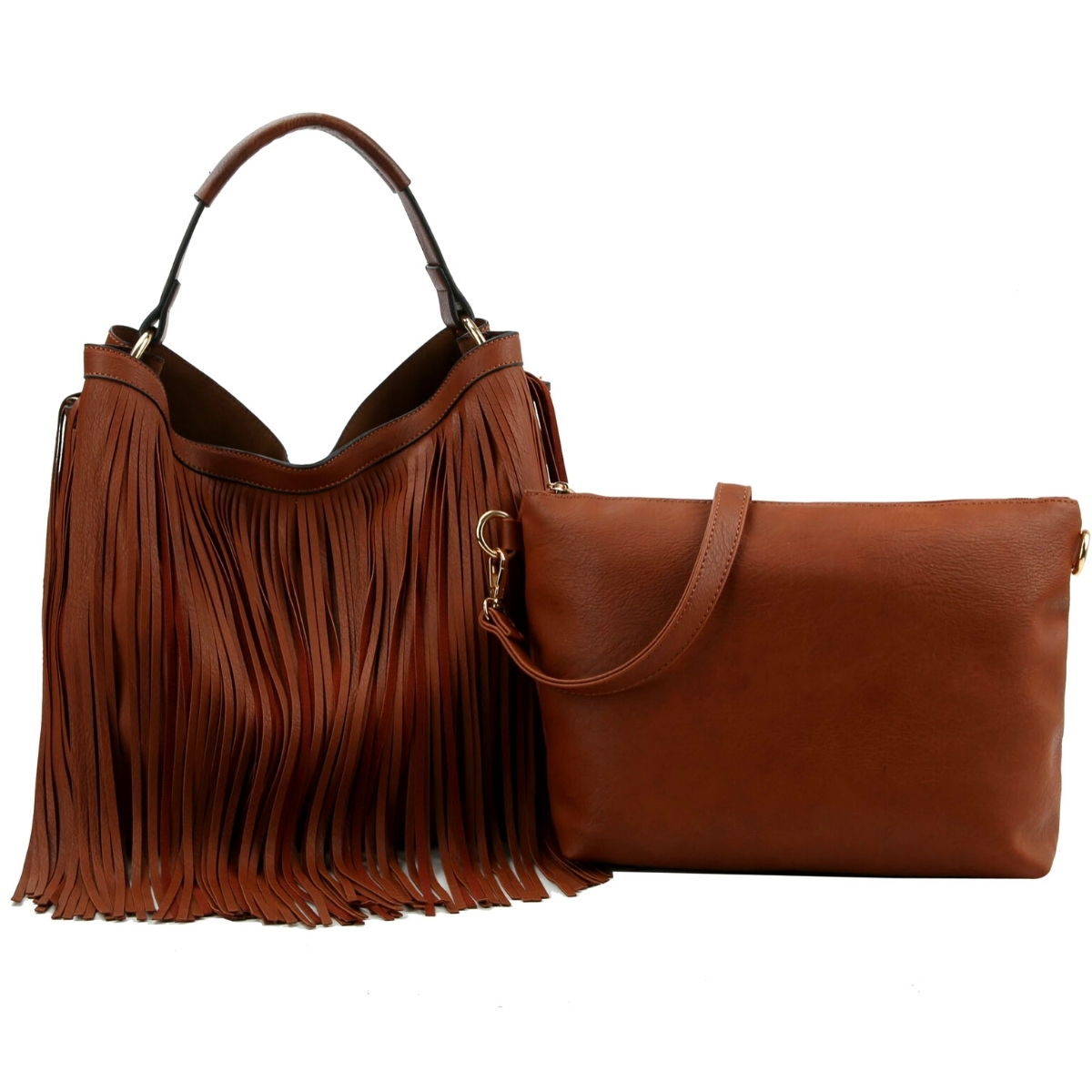 Brown Vegan Leather Fringe Hobo Handbag Set. Includes Matching Inner Zipper Pouch with Detachable Shoulder Strap. Magnetic Main Bag Closure