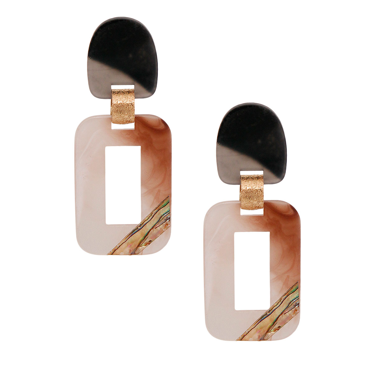 Brown Marbled Rectangle Drop Earrings Featuring Abalone Shell Detailing. Earrings measure 1.15 inches wide. Please allow for natural color variations