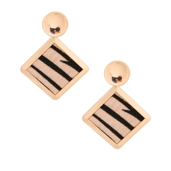 Gold Metal Circle Earrings Featuring Diamond Shape Drop Detail with Brown Zebra Vegan Fur. Earrings measure 2.25 inches wide