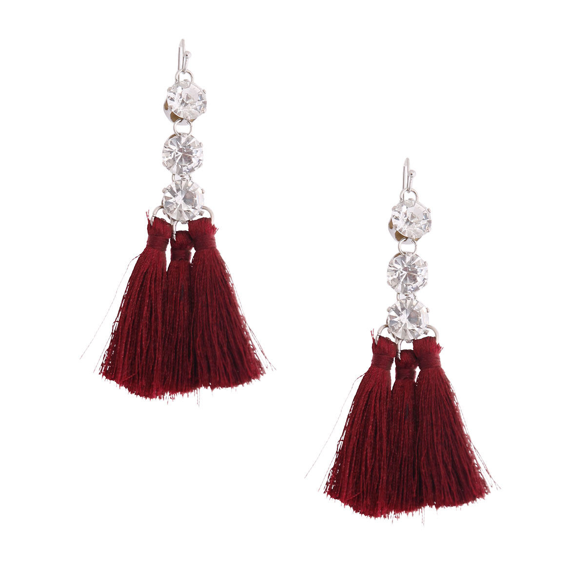 Silver Metal Fish Hook Earrings Featuring Tripe Crystal and Triple burgundy Tassel Drop Detail. Earrings measure 1.5 inches wide