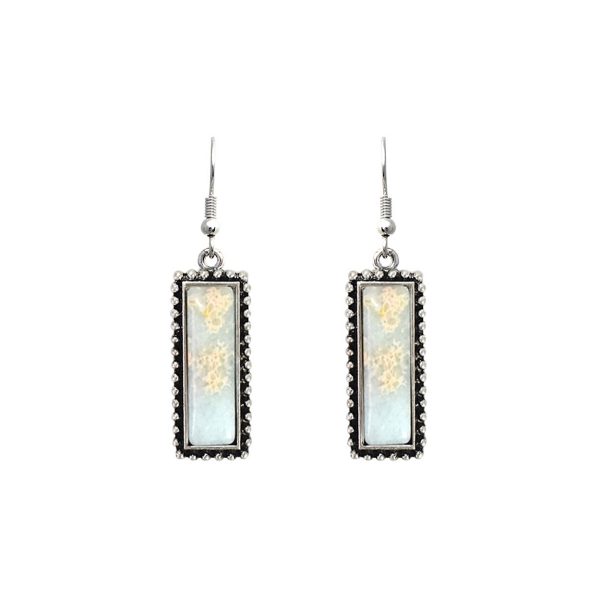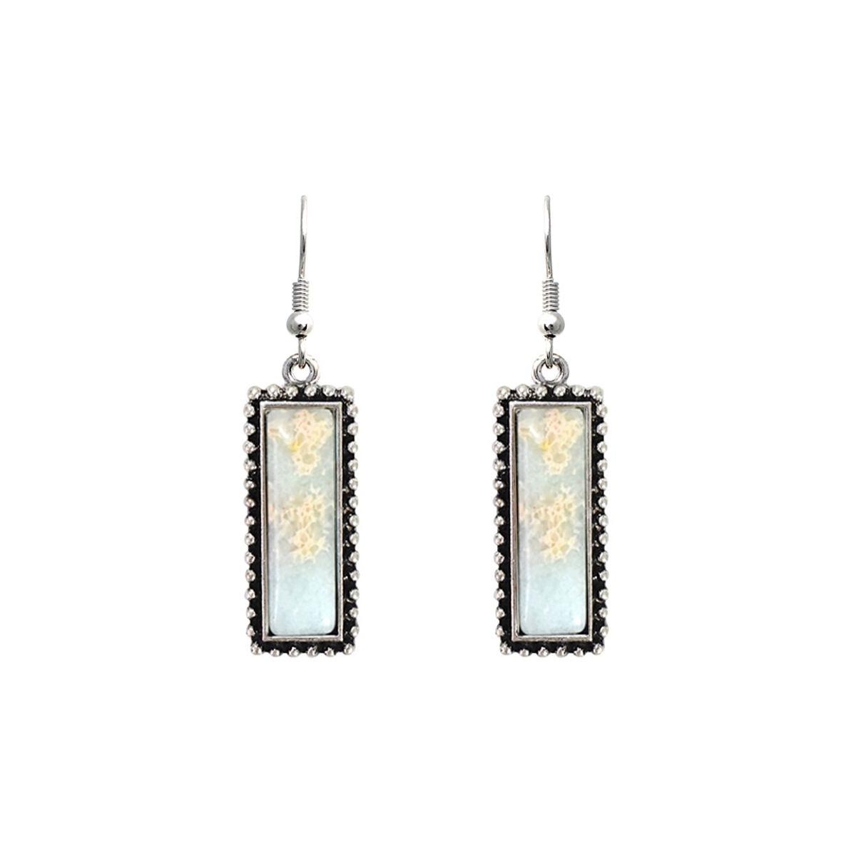 Burnished Silver Metal Rectangle Fish Hook Western Boho Drop Earrings Featuring Cream Resin Detail. Earrings measure .48 inches wide