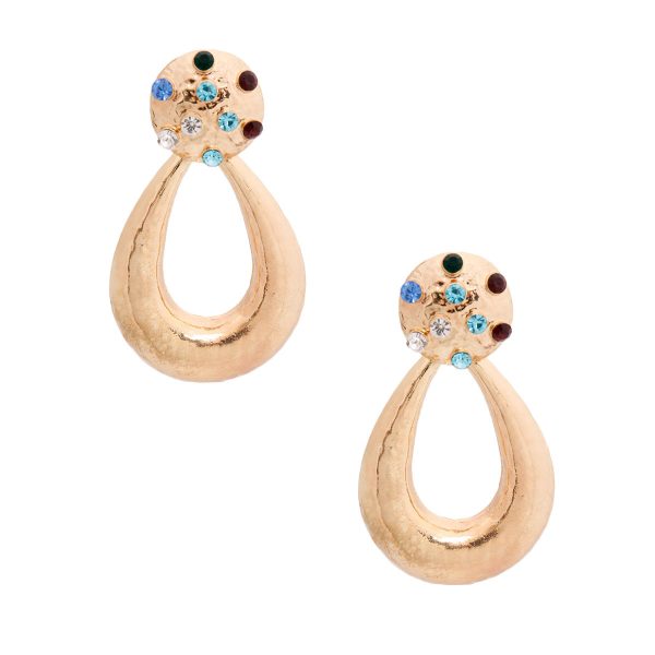 Chunky Burnished Gold Teardrop Earrings Featuring Multi Color Crystal Rhinestone Detailing. Earrings measure 1.75 inches wide