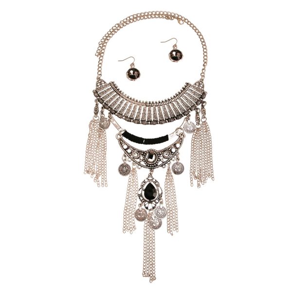 Engraved Burnished Silver Metal Necklace Set Featuring Black Crystals, Coins, and Drop Chain Detailing. Drop measures 8 inches long