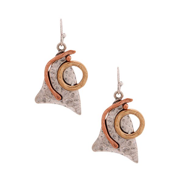 Burnished Silver Triangle Shaped Drop Earrings Featuring Mixed Metal Details. Earrings measure .85 inches wide