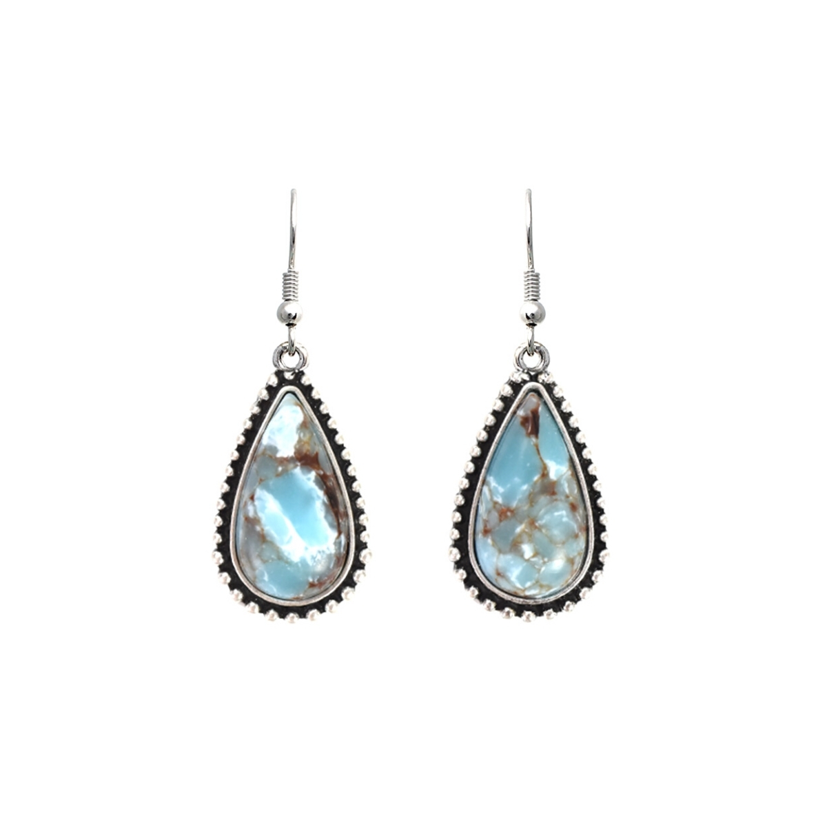 Burnished Silver Metal Teardrop Fish Hook Western Boho Drop Earrings Featuring Turquoise Resin Detail. Earrings measure 0.7 inches wide