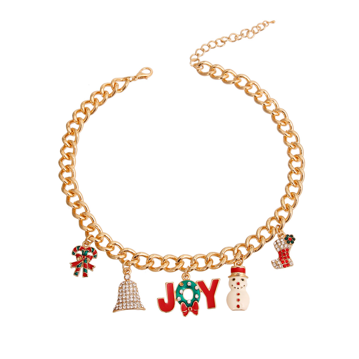 Gold Metal Chain Necklace Featuring 5 Rhinestone Christmas Themed Charms. JOY Charm measures 1.75 inches wide