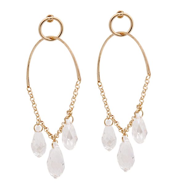 Gold Metal Ring Earrings Featuring Drop Semi Circle and Draped Chain with Clear Textured Teardrop Bead Details. Earrings measure 1.45 inches wide