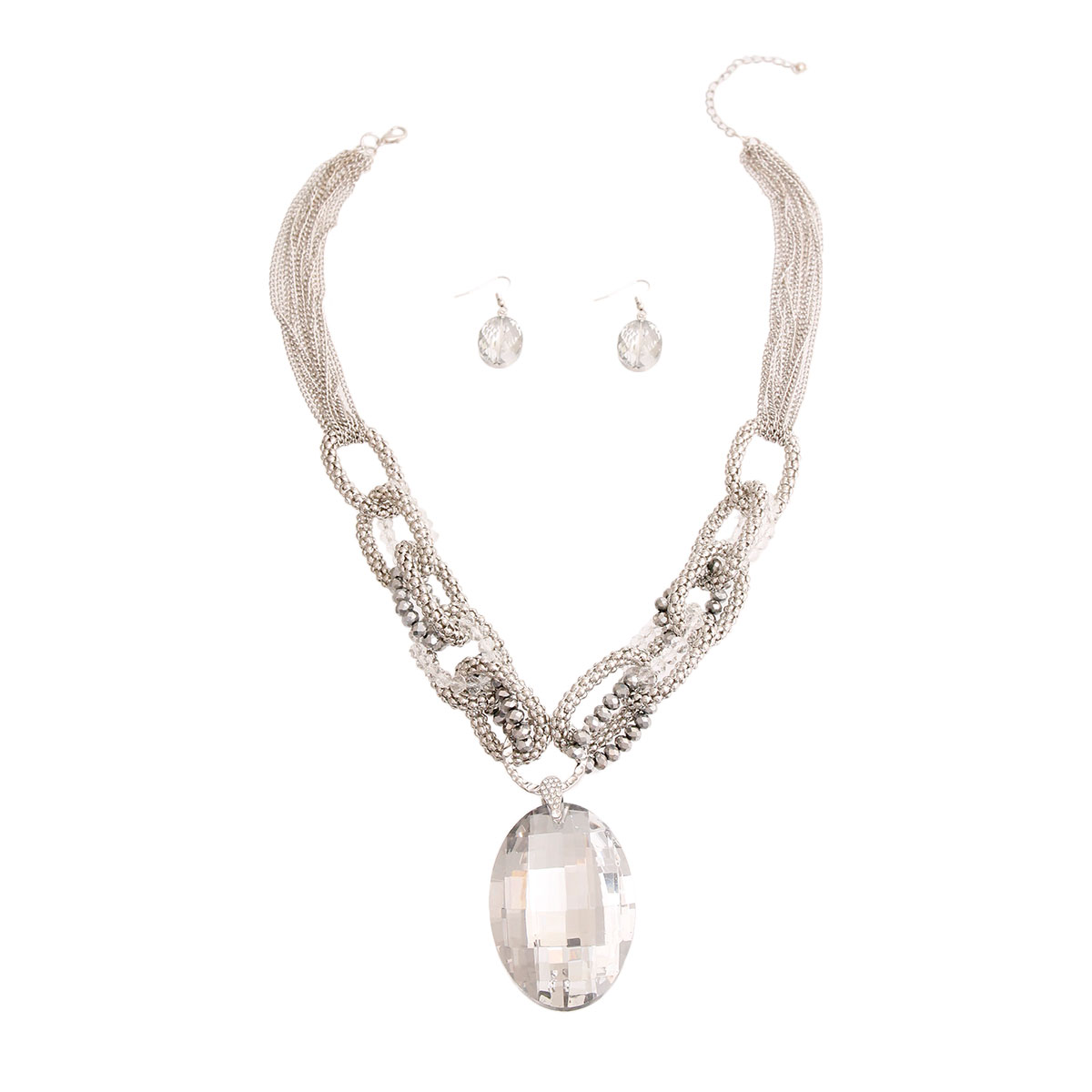 Silver Metal Chain Multi Strand Necklace Set Featuring Large Hollow Metal and Bead Chain Links with Chunky Oval Clear Crystal Pendant. Pendant measures 3 inches long and 2 inches wide