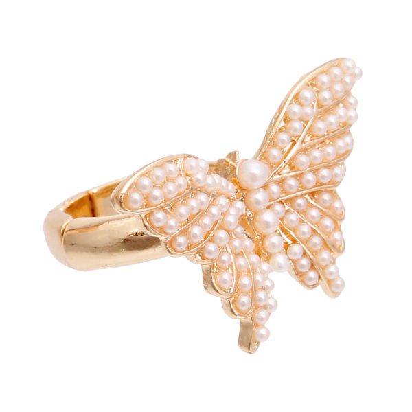 Gold Metal Stretch Ring Featuring Butterfly with Cream Pearl Detailing. Butterfly measures 1.5 inches wide and 1 inch long