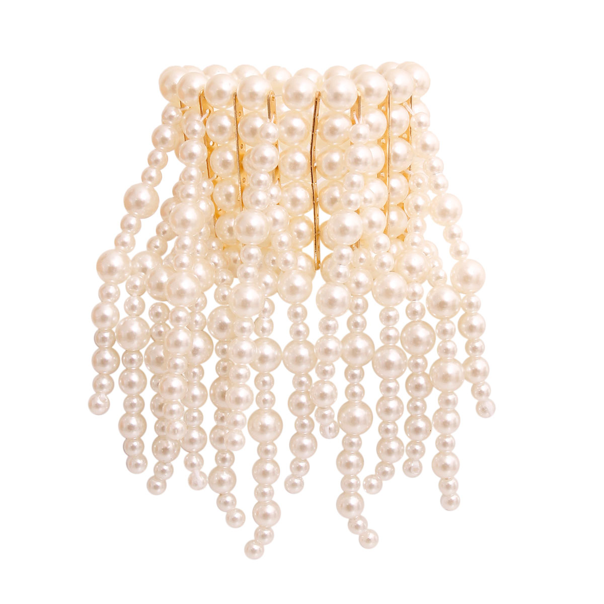Gold and Cream Pearl Stretch Bracelet Featuring Drop Pearl Fringe. Bracelet measures 2.25 inches wide. Pearl Drops measure 3.5 inches long