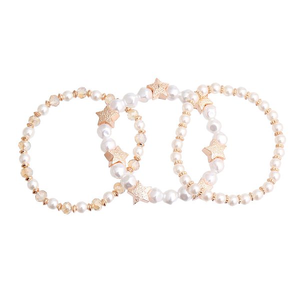 Gold Star and Cream Pearl Stretch Bracelet Set. 3 Pcs Set