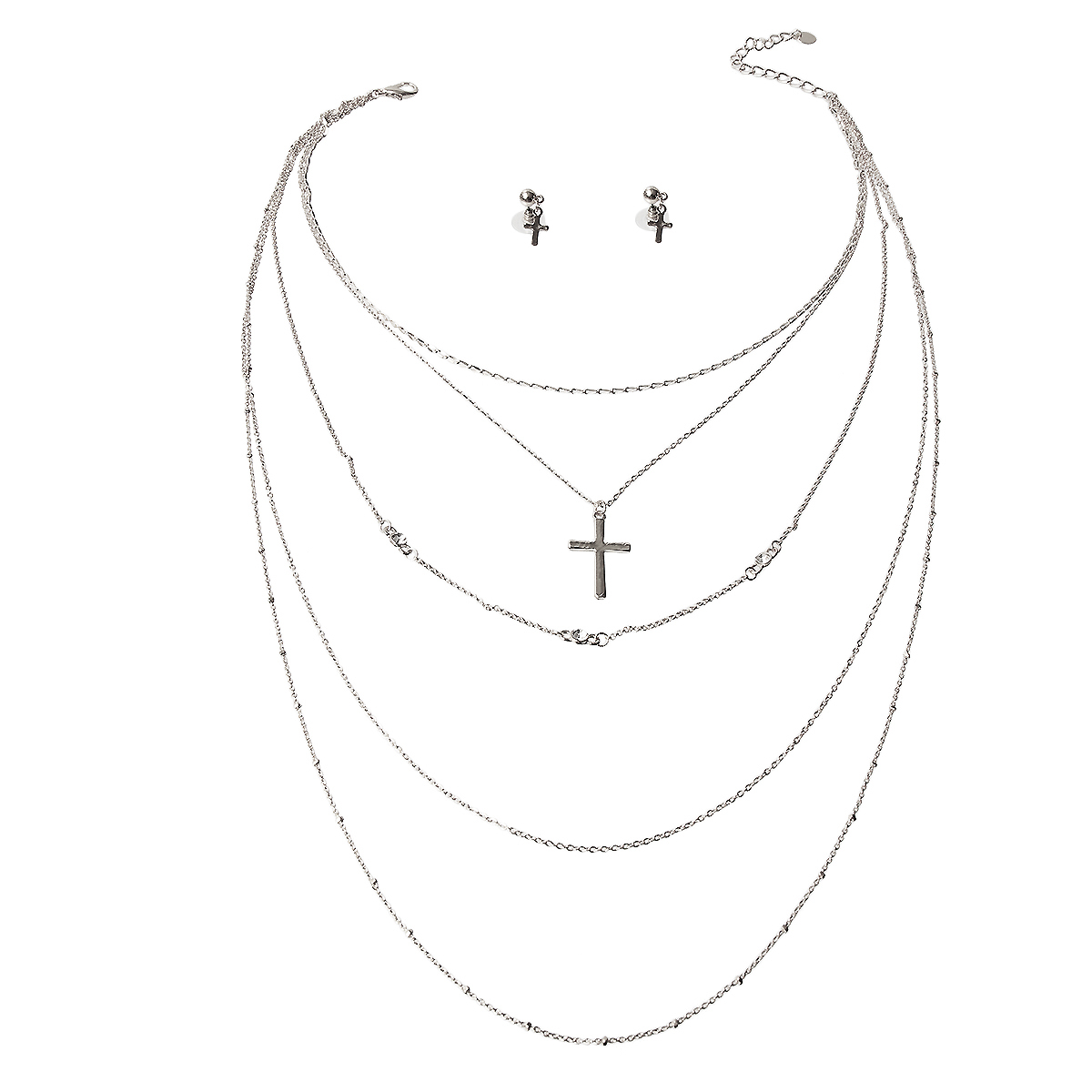 Silver 5 Layer Long Necklace Set Featuring Cross Pendant and Rhinestone Detail. Cross measures 1.05 inches