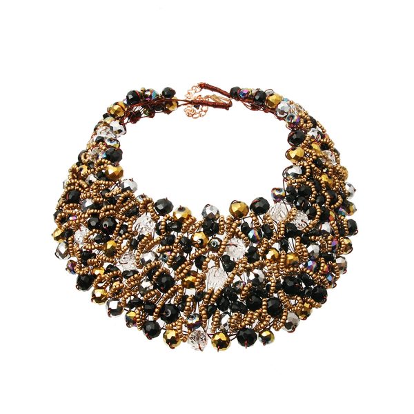 Metallic Black, Gold, and Silver Bead Copper Bib Style Necklace. 3 inches wide. Matching earrings available to purchase separately. Handcrafted. Fair Trade. Exclusive
