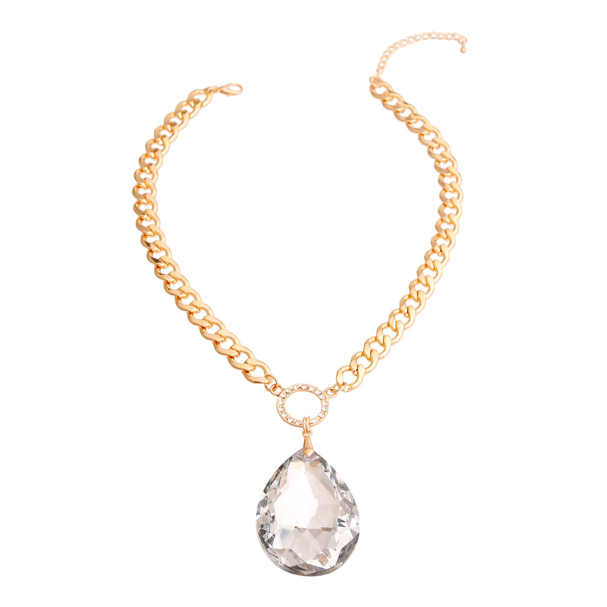 Gold Metal Chain Necklace Set Featuring Large Clear Crystal Teardrop and Rhinestone Circle Pendant. Pendant measures 3.75 inches long