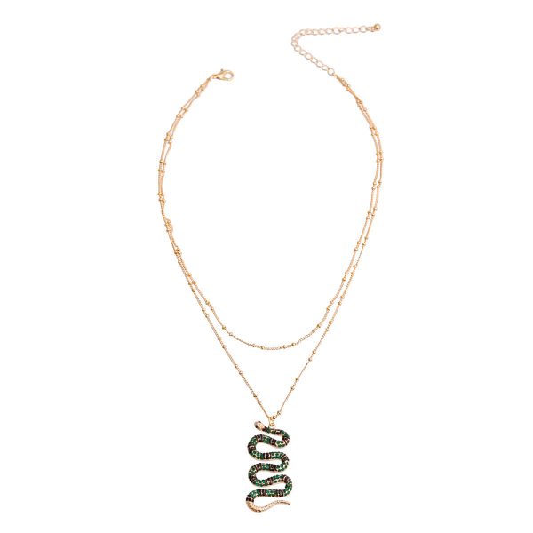 Designer Style Gold Metal Chain Double Layer Necklace Featuring Striped Green Rhinestone Snake Pendant. Pendant measures 1.75 inches long