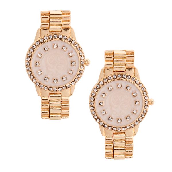 Designer Inspired Gold Metal Watch Shape Earrings Featuring Ivory Watch Face with Rhinestone Detailing. Earrings measure 1.15 inches wide