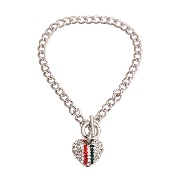 Designer Style Silver Metal Chain Toggle Bracelet Featuring Small Pave Heart Charm with Red and Green Stripe Rhinestone Detailing. Heart measures .65 inches