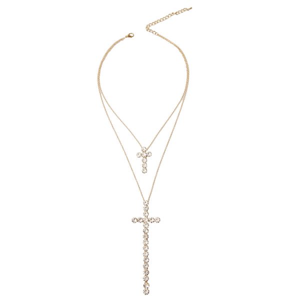 Gold Double Layer Chain Featuring Rhinestone Cross Pendants. Small Cross Measures 1.25 inches long. Large Cross measures 4 inches long.