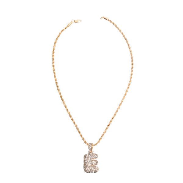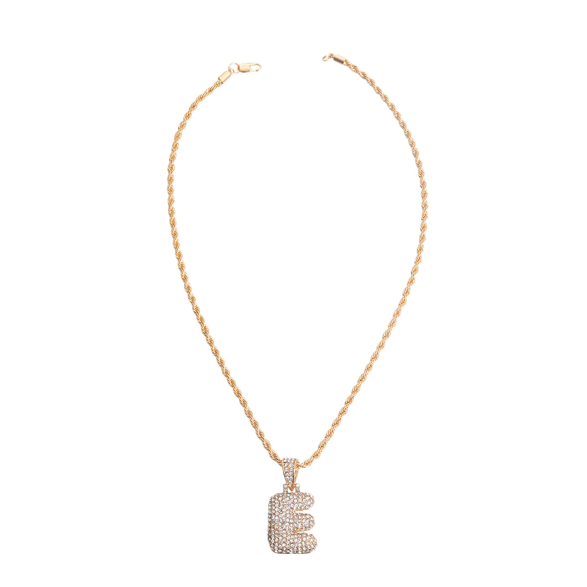 Gold Metal Twisted Chain Necklace Featuring Letter E Crystal Rhinestone Pendant. Pendant measures 1.75 inches long