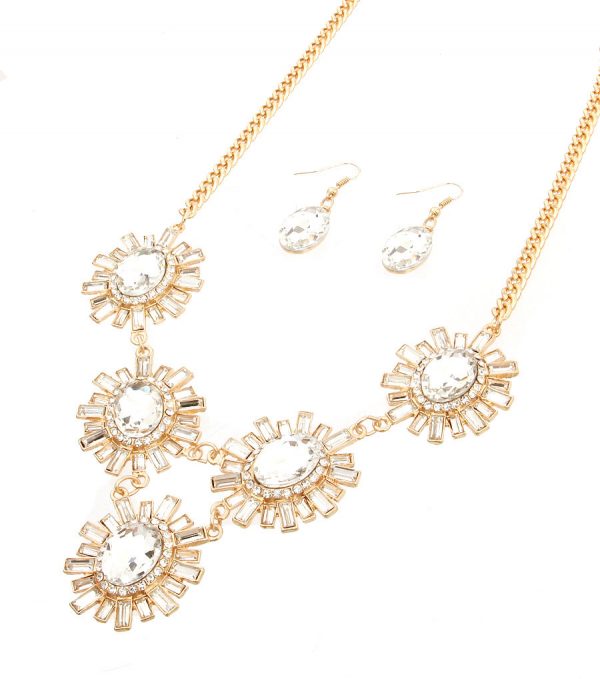 Gold metal chain necklace set with clear stones flower pendants. Lobster clasp closure