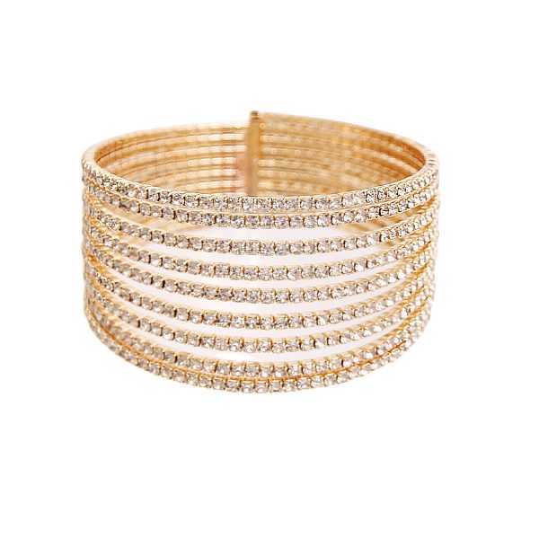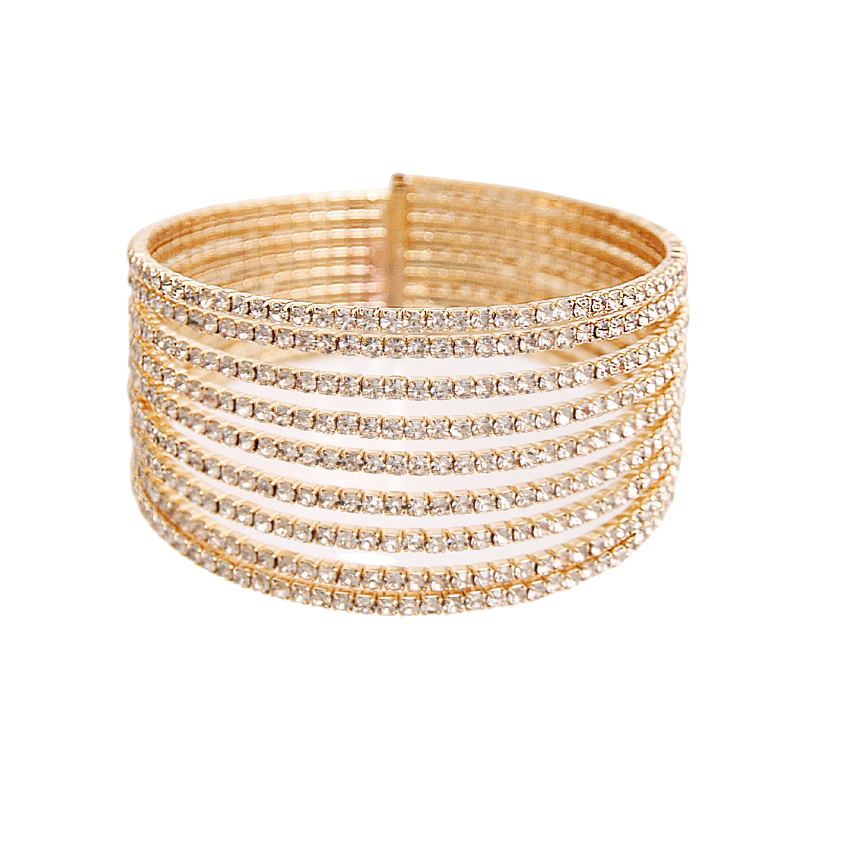Gold Metal Wire Wrap 9 Line Bracelet Featuring Clear Rhinestone Detailing. Bracelet measures 1.25 inches wide
