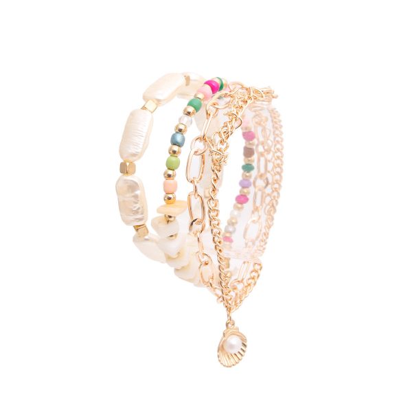 4 Pcs Bracelet Set. 2 Gold Metal Chain Link Bracelets Featuring Gold Metal Oyster and Cream Pearl Charm. 1 Multi Stone Bead Stretch Bracelet. 1 Plastic and Metal Cream and Gold Stretch Bracelet. Includes 4 Pcs