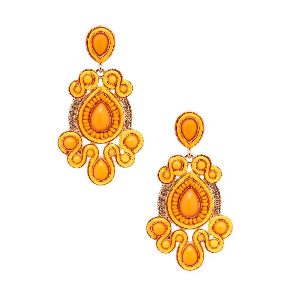 Gold Metal and Mustard Soutache Drop Earrings Featuring Bead and Rhinestone Details. Earrings measure 1.75 inches wide